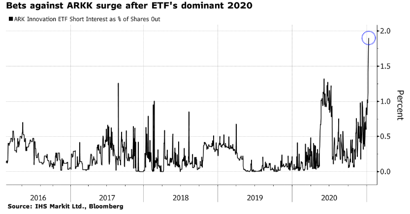 虽然资金经理们通常购买ETF的看跌期权来保护其投资组合免受市场下跌的影响,但期权通常与被动管理的指数基金(例如SPDR S&P 500 ETF Trust)挂钩。然而,重押科技股的方舟创新基金增长如此之快,从2019年底的19亿美元增至2月中旬的280亿美元,以至于一些资金经理将这个积极管理的基金视为缓冲股市下跌更好的选择。