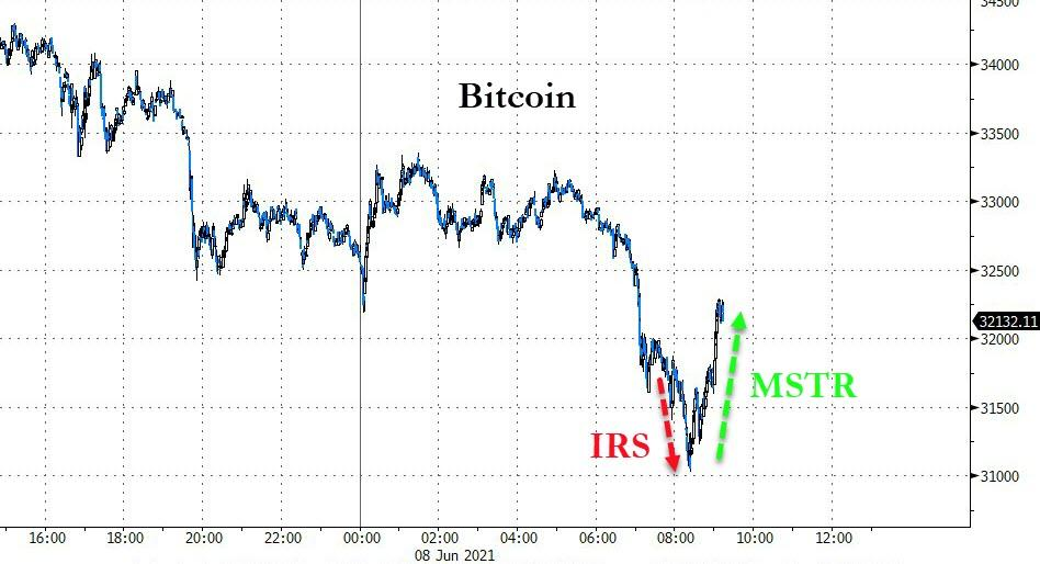 在IRS要求国会授权更严监管加密货币的消息公布之后,比特币跌幅扩大,最低曾探至31000美元附近。