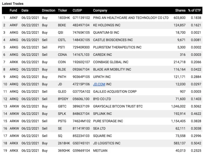 Cathie Wood旗下方舟投资(Ark Invest)一份交易报告显示,利用周二比特币的低迷走势,Ark的旗舰基金——创新ETF(ARKK)又购买了214718股Coinbase公司股票,后者为全球最大数字货币交易所。