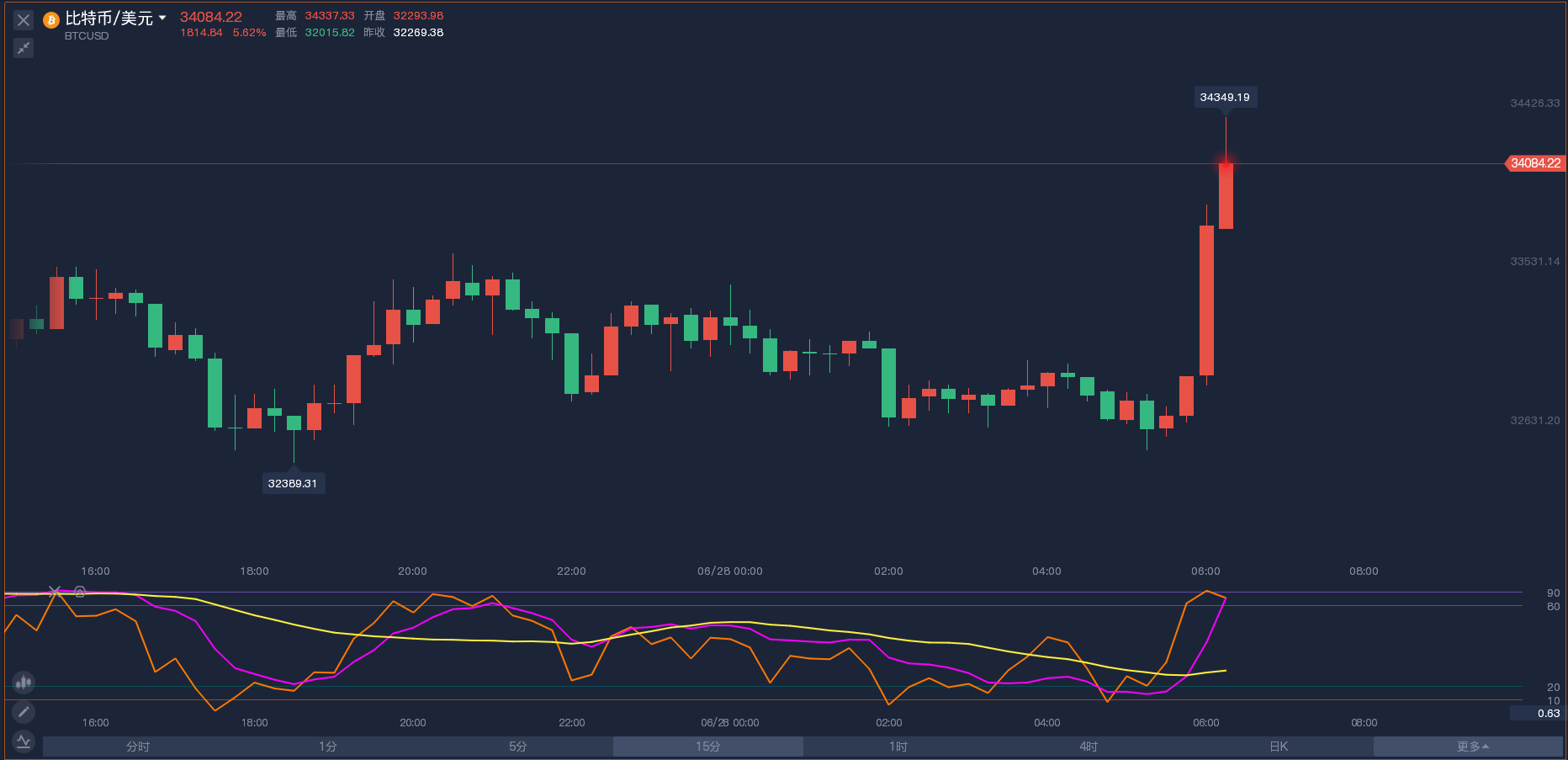 周一(6月28日)早盘,比特币涨幅扩大,短线走高超1200美元,日内涨超6%,至34185.00美元/枚。