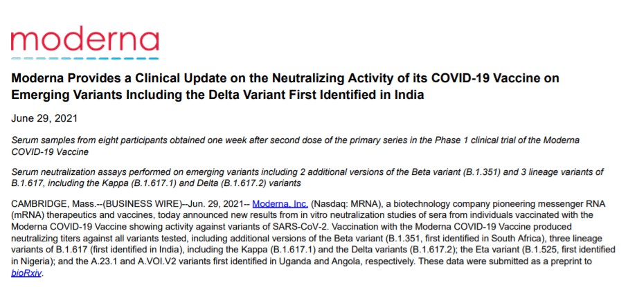 根据一项针对接种Moderna疫苗的个体血清的体外中和研究显示,该疫苗产生了对所有测试变体的中和效价,其中也包含了近来令许多国家加强封锁措施的德尔塔病毒。