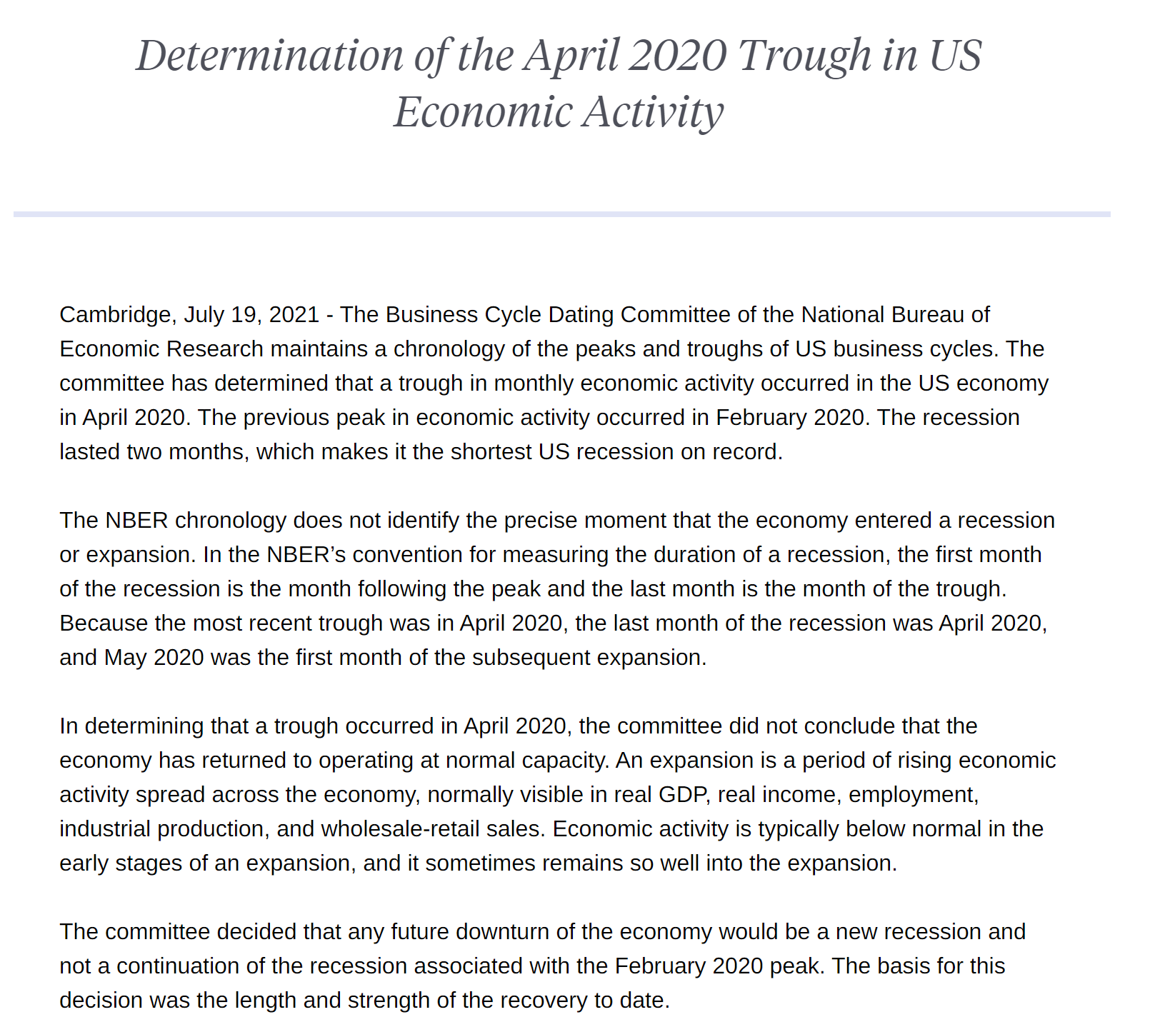 “在决定是否认定经济衰退时,委员会要权衡经济萎缩的深度、持续时间,以及经济活动是否普遍下滑(衰退的扩散),此次的衰退与之前的衰退有不同的特征和动力。尽管如此,委员会的结论是,就业和生产的空前规模的下降,以及其在整个经济中的广泛影响,有理由将这段时期称为衰退,尽管这次衰退比之前的收缩要短暂。”