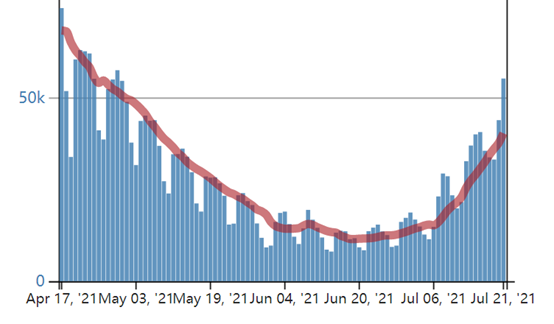 美国疾控中心表示,截至7月22日,美国已有逾1亿8721万人至少接种了一剂新冠疫苗,其中逾1亿6217万人完全接种。但美国的疫苗接种进度呈减缓之势,这是近期美国新冠病例激增的最主要原因。