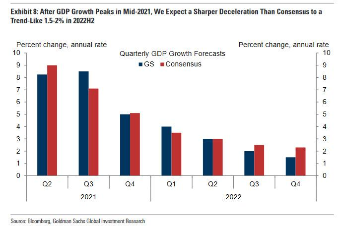 知名投行高盛在本周一发布了最新的美国经济研究报告,指出受到服务业消费复苏弱于预期等因素影响,2022年美国GDP增速将快速回落至1.5%至2%水平,降幅水平超过市场平均预期。除此之外,高盛还将今年三、四季度的GDP增速分别下修1个百分点至8.5%和5%。