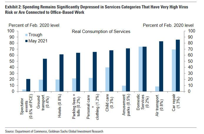 高盛在报告中解读称,与疫情传播风险以及办公室出勤有关的服务业类目整体上处于压抑的状态,诸如现场音乐会、地上交通和干洗服务等。
