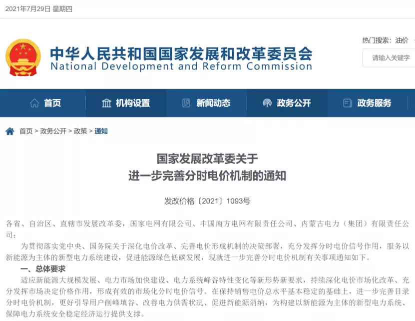 7月29日,国家发展改革委发布《关于进一步完善分时电价机制的通知》,对现行分时电价机制作了进一步完善,包括优化峰谷电价机制、建立尖峰电价机制、建立健全季节性电价机制和丰枯电价机制、明确分时电价机制执行范围、建立动态调整机制以及加强与电力市场的衔接等。
