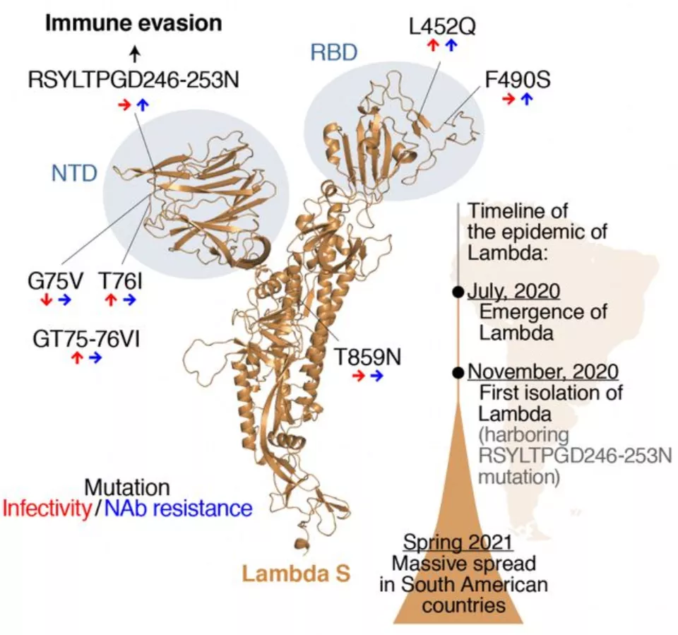 研究还指出,突变让拉姆达变异毒株可以对抗免疫性,其中RSYLTPGD246-253N突变负责逃避中和抗体,专家将这种突变描述为“独特”的突变,只存在于拉姆达变种病毒中。