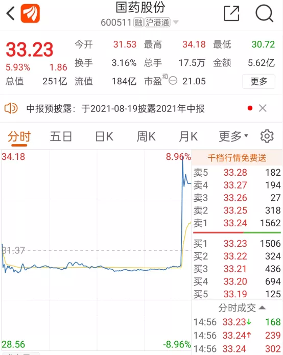 中国生物官宣时点是8月4日下午2点左右,二级市场反应非常迅速。国药集团旗下2家上市公司:国药股份、国药一致突然直线拉升,国药股份一度大涨超8%。截至收盘,国药股份涨幅近6%,国药一致收涨2.86%。