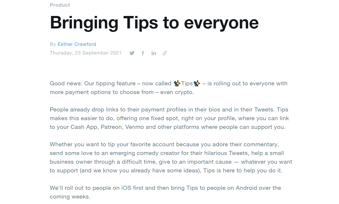 当地时间周四,推特发布官方公告称,即日起在iOS客户端上线已经测试数月的打赏功能,除了常规支付工具外,这项功能也支持通过比特币支付。公司表示,安卓客户端也将在未来数周上线这一功能。