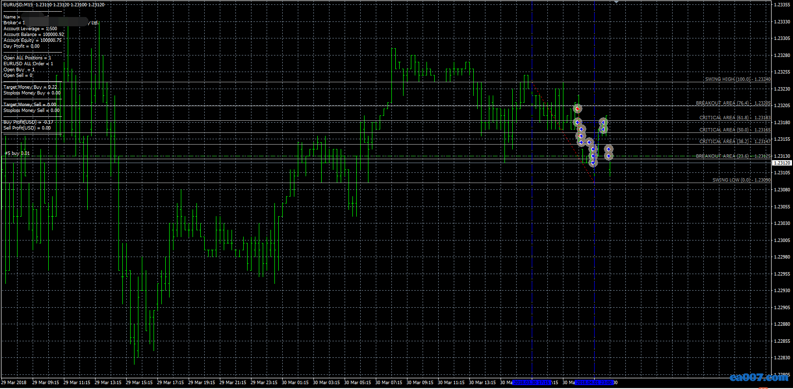有四个参数最为重要,StartBar,BarsBack,确定判断多少K线,判断的K线越多,箱体就越大.HighFibo,LowFibo确定开仓的高低点,取值范围在0-100.这个EA就是通过这种方式判断开仓的位置的.